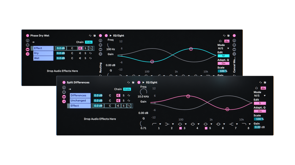 The first one, Phase Dry Wet, takes in two signals, a "Dry" and a "Wet", puts them through an effect, and then cancels out the original version of the wet signal. This leads to the effect placed inside the rack acting as a sort of mixer for the 2 chains. For example, placing an EQ inside allows you to control the mix based on frequency!